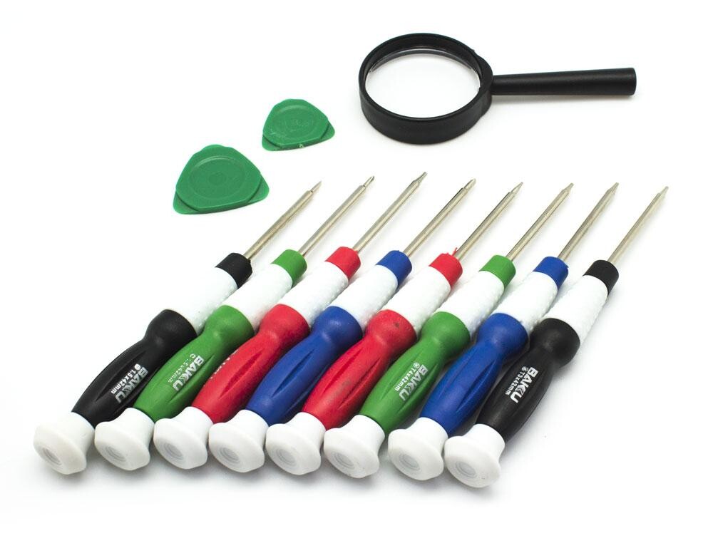 - Todo lo que necesitas para cualquier reparación en tu smartphone, con este kit de destornilladores de alta precisión, fabricados de acero al cromo-vanadio de alta calidad,.ya no tendrás que preocuparte de nada. Inclye 8 destornilladores, un pequeño cúter, una herramienta separadora y unas pinzas.