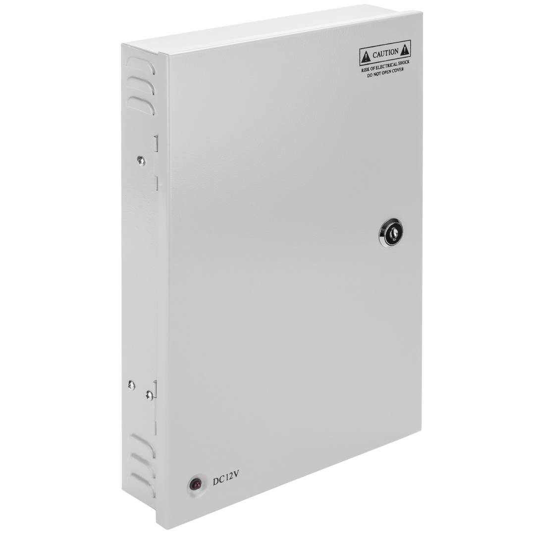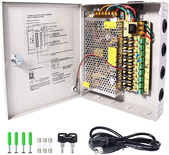 Fuente de alimentación de CC Puerto de salida de 9 canales 12 V/150 W CCTV Caja eléctrica Fuente de alimentación distribuida - Caja con línea de alimentación de CA y llave (9CH 10.5A)