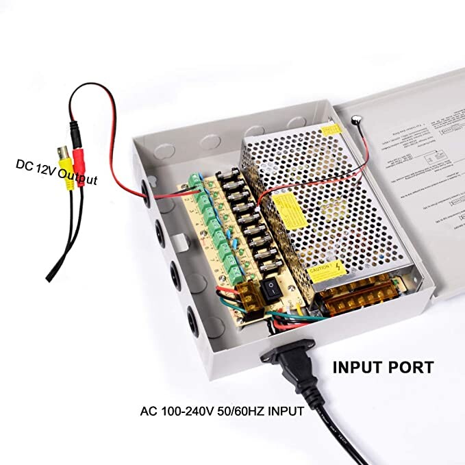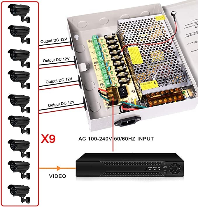 La potencia total de esta fuente de alimentación CCTV es de 150 W, 150 W/7 W = 21,4, por lo que puede controlar cámaras de monitor de 21 * 4 W.