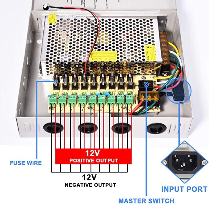 Caja de fuente de alimentación CCTV DC 12V 12.5A 150W, salidas de 9 canales protegidas con fusible.