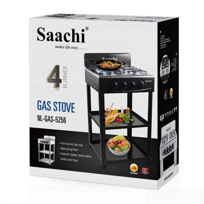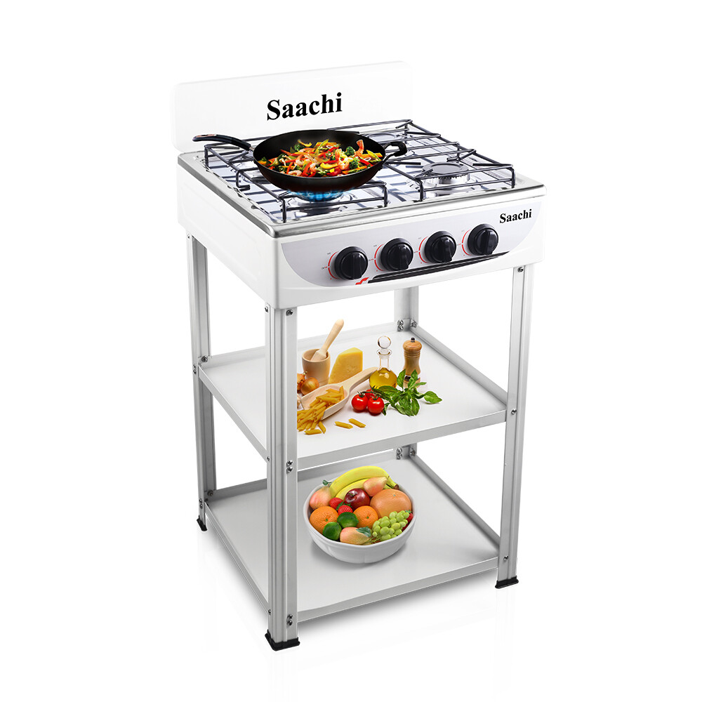 Ahorre espacio en la cocina mientras disfruta de los beneficios de una cocina de gas moderna con una estufa de gas de 4 quemadores Saachi con carro de 2 bandejas para el almacenamiento de alimentos.
