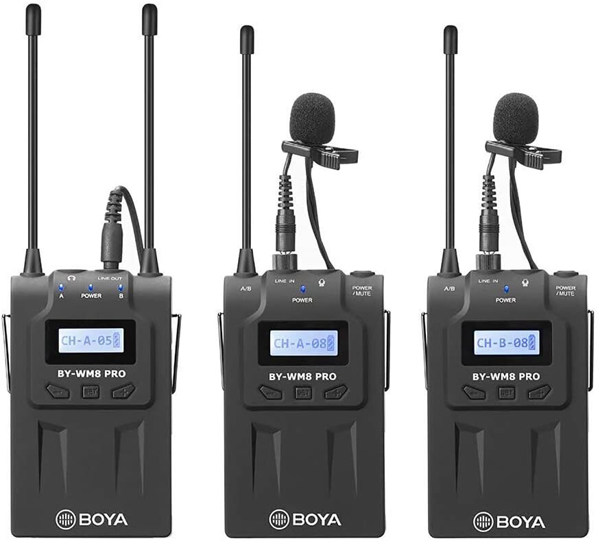 El sistema de micrófono de solapa inalámbrico BY-WM8 Pro-K2 UHF de doble canal, doble (2x) bodypacks de Boya incluye dos transmisores de bolsillo inalámbricos TX8 Pro UHF de 48 canales, un receptor inalámbrico UHF portátil RX8, dos micrófonos lavalier omnidireccionales, dos estéreo Cables mini-jack de 3,5 mm y dos cables XLR de 3 pines. Este sistema cuenta con una pantalla LCD de fácil lectura y es adecuado para una amplia gama de operaciones como entrevistas, ENG (recopilación de noticias electrónicas, EFP (producciones de campo electrónicas), producción de películas, aplicaciones comerciales y educativas. El sistema Pro-K2 se monta fácilmente en DSLR, videocámaras y cámaras de video e incluye un zapato desmontable con perilla de bloqueo y clips para el cinturón. Otras características incluyen: un ancho de banda de RF de conmutación amplio, sintonización sintetizada por PLL, circuitos de compresión digital, entradas de micrófono y línea, mute, y una salida de audífonos para monitoreo en el receptor. Además, cada transmisor y receptor es alimentado por dos baterías AA de 1.5V y ofrecen más de 6 horas de operación continua. El rango de operación sin obstáculos es de 300 '. El LED de encendido se ilumina en azul cuando la unidad está encendida y en rojo cuando la energía es baja Finalmente, los cables de corbata y de salida terminan con conectores de bloqueo de 3,5 mm para permanecer en su lugar de forma segura durante el funcionamiento. Se requieren baterías.