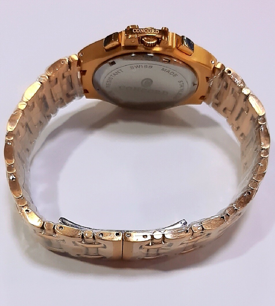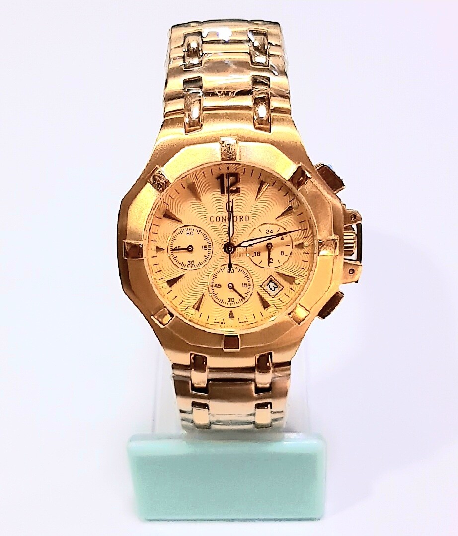 Saratoga Chrono para hombre, reloj automático; Caja de 43 mm de acero inoxidable, 13,85 mm de profundidad, con corona de acero inoxidable, CONCORD grabado en el protector de la corona; pulsadores de acero inoxidable y pulsador a las 10 horas; fondo de caja abierto de acero inoxidable; esfera plateada con contadores e índices con SLN; rodio de bastón de horas y minutos con SLN y ventana de fecha; brazalete de acero inoxidable con cierre desplegable de botón.