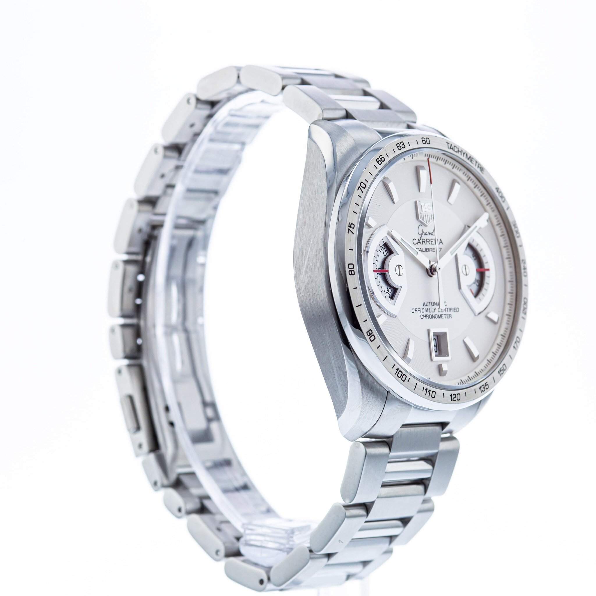 Un reloj exquisito vestido de acero inoxidable, el reloj TAG Heuer Grand Carrera Chronograph Calibre 17 RS para hombres es un cronógrafo elegante del más alto calibre. Su comportamiento elegante comienza con una caja de acero inoxidable de 43,5 mm y un bisel fijo de acero inoxidable, que cuenta con un taquímetro con marcadores negros. El lado derecho del reloj presenta una corona estriada atornillada de acero inoxidable protegida con dos pulsadores. La esfera circular plateada guilloché, que está protegida por un cristal de zafiro resistente a los arañazos, ofrece marcadores de hora índice en tonos plateados luminosos y agujas accionadas por un movimiento automático suizo. El dial también ofrece una ventana de visualización de la fecha en la posición de las 6 en punto y dos subesferas de cronógrafo con pantallas de 30 minutos y 60 segundos. Un brazalete de acero inoxidable sujeta el reloj a su muñeca, mientras que un lujoso cierre plegable oculto con doble botón asegura que permanezca allí. Finalmente, el reloj ofrece una resistencia al agua de hasta 330 pies (100 metros).