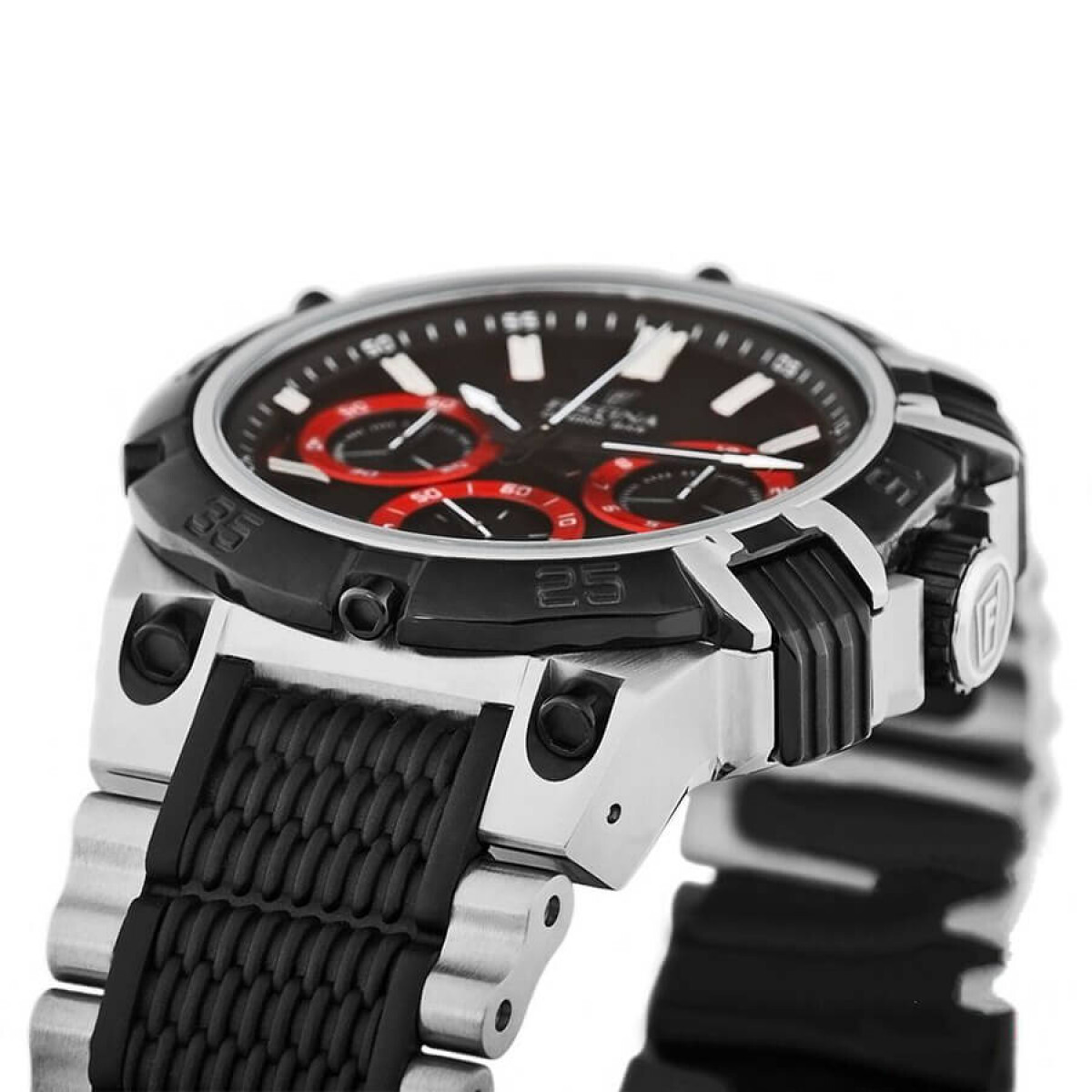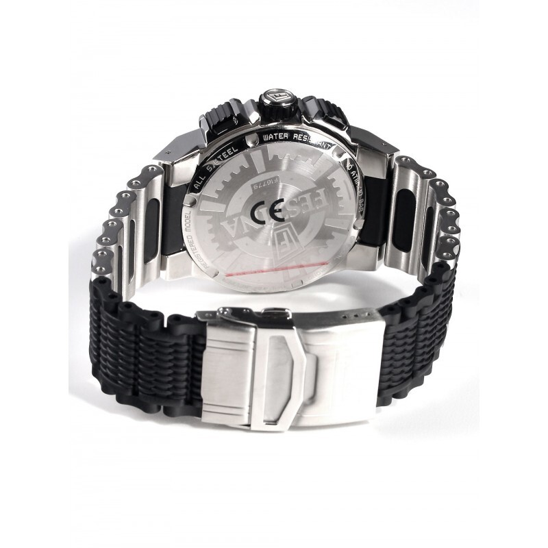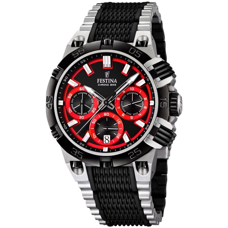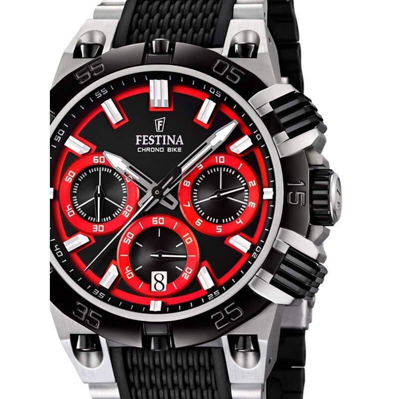 Reloj Festina para hombre. Caja de acero inoxidable plateada y correa de acero inoxidable plateada. Esfera negra. Movimiento de cuarzo. Cierre de broche de despliegue. Resistencia al agua de 100 metros.